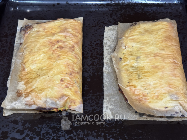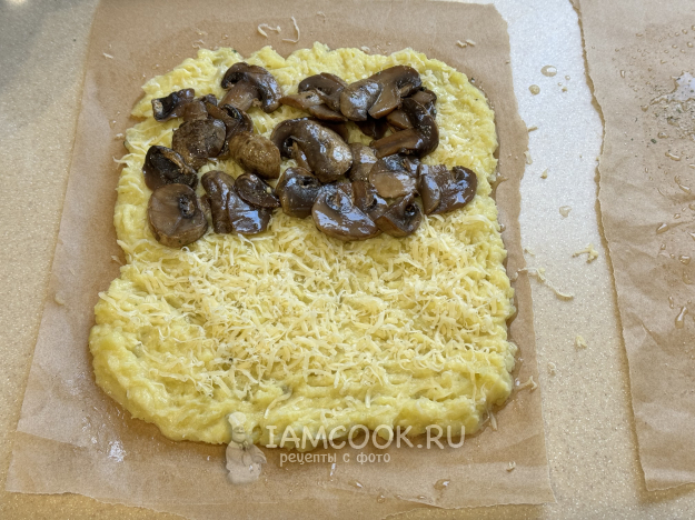 Разделить картофельную массу на две равные части и выложить на пергамент. Разровнять в прямоугольный пласт.