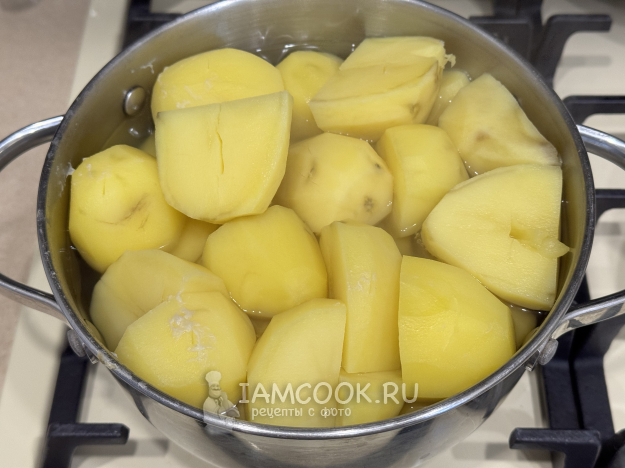Картошку почистить и поместить в кастрюлю. Залить водой и поставить на огонь. Варить картошку до готовности.