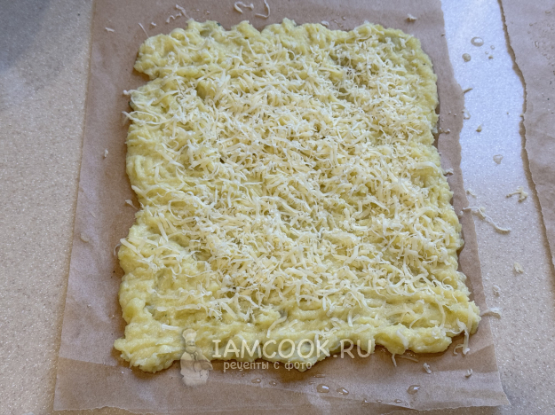 Сыр натереть на мелкой терке и присыпать им картофельную массу.