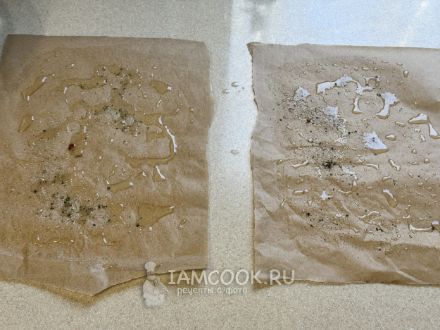 Два листа пергамента смазать растительным маслом и присыпать любыми специями.