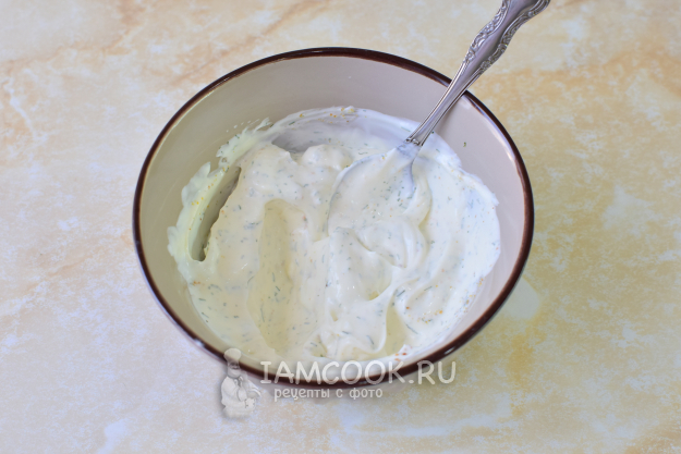 Для соуса смешайте сметану с майонезом. Добавьте измельченный чеснок. По вкусу добавьте соль и специи.