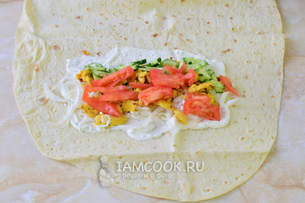 Подверните края лаваша и сверните шаурму в рулет.