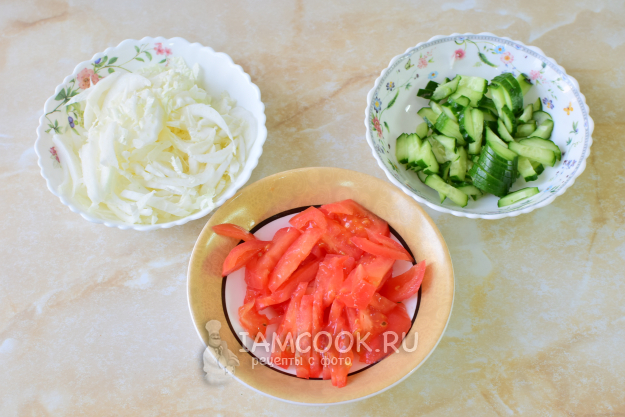 Подготовьте для начинки овощи. Нарежьте пекинскую капусту, огурец и помидор.