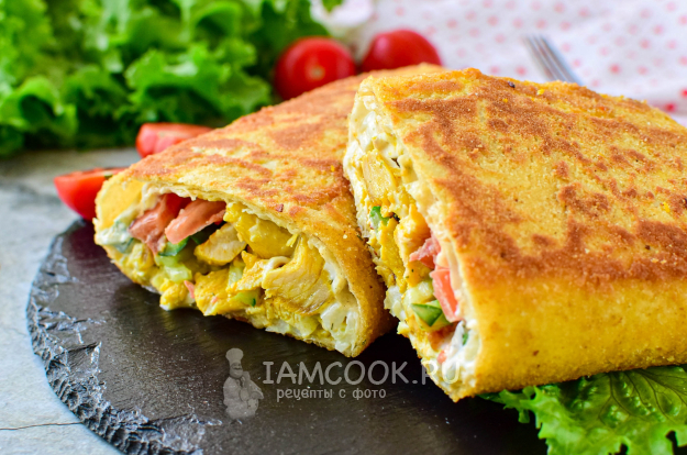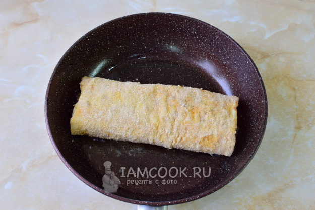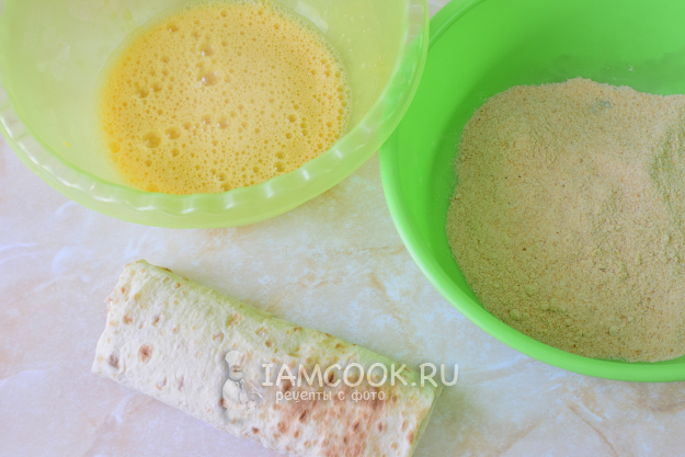 Для аппетитной царской корочки в одну чашу насыпьте панировочные сухари, а в другой взболтайте яйцо. Окуните шаурму в яйцо, а затем обваляйте в панировочных сухарях.