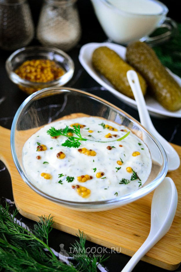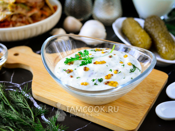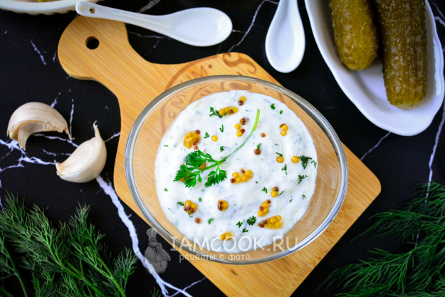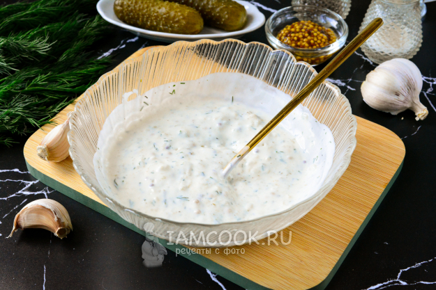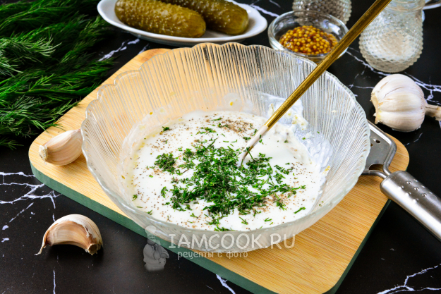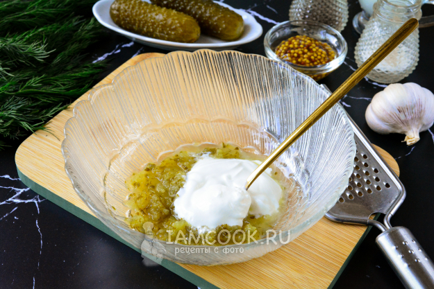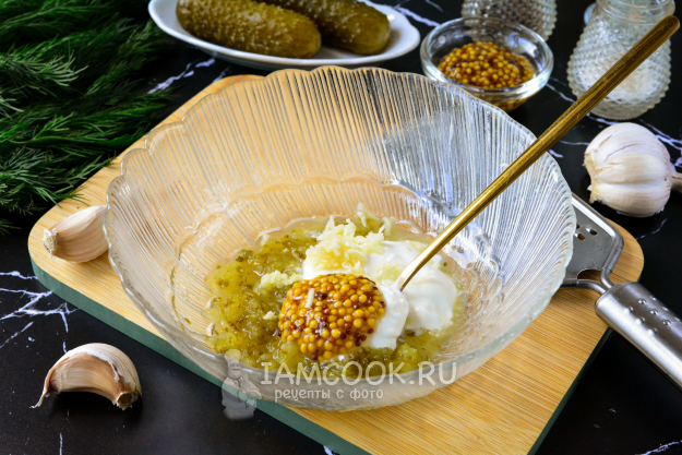 В соус добавьте дижонскую горчицу в зернах и натрите туда же чеснок на мелкой терке. Перемешайте ингредиенты.