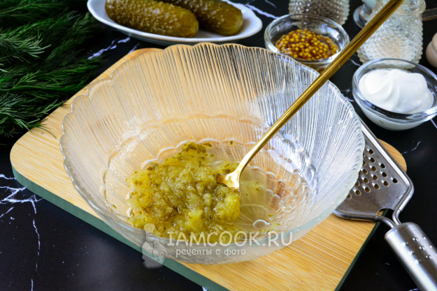 Соленые огурцы натрите на мелкой терке, лишнюю жидкость слейте. Также можете натертую массу выложить в сито, таким образом влага уйдет.
