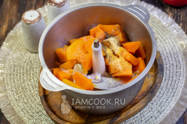 Переложите овощи в чашу блендера, добавьте соль, черный молотый перец и молотый чеснок.