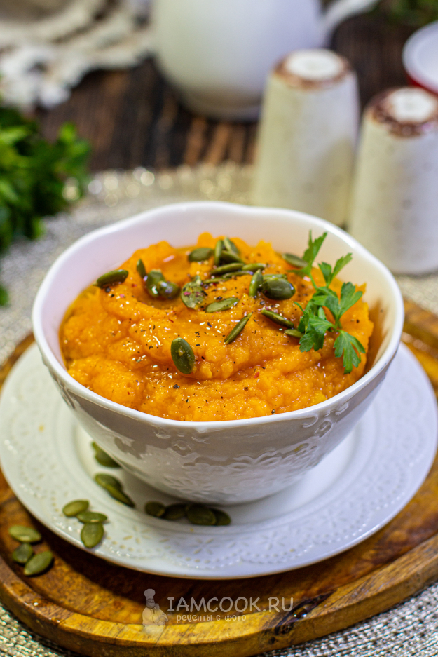 Подавайте пюре тёплым, полив небольшим количеством оливкового масла и посыпав тыквенными семечками для приятной текстуры и лёгкой ореховой нотки. Приятного аппетита!