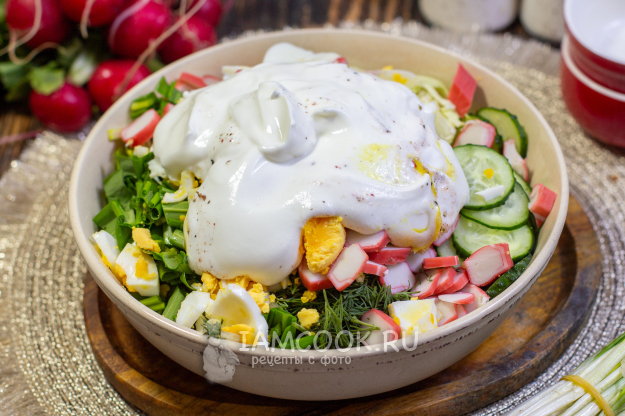 На стол салат «Весенний» с крабовыми палочками подавайте охлаждённым — он получается очень сочным, свежим и отлично подойдёт как для повседневного стола, так и для лёгкого праздничного меню. Приятного аппетита!