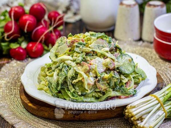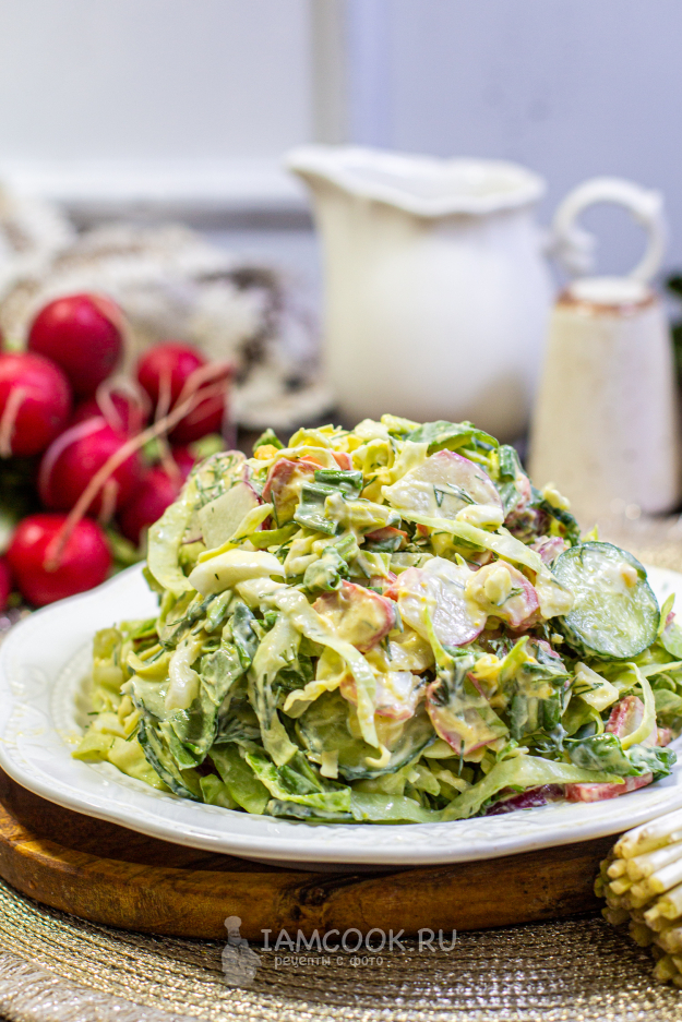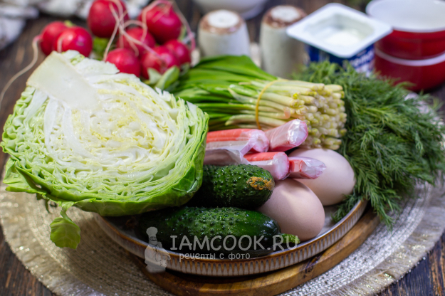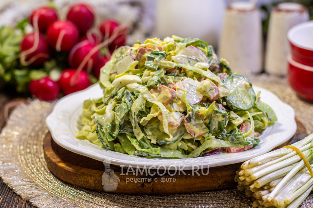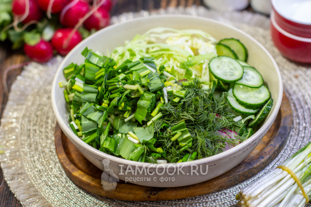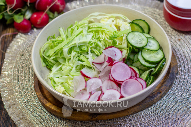 Молодую капусту тонко нашинкуйте и слегка помните руками, чтобы она стала мягче и сочнее. Редис и огурцы помойте и обсушите, нарежьте тонкими кружочками.