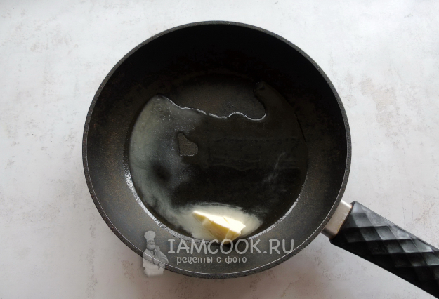 На горячую сковороду налейте растительное масло и выложите сливочное.
