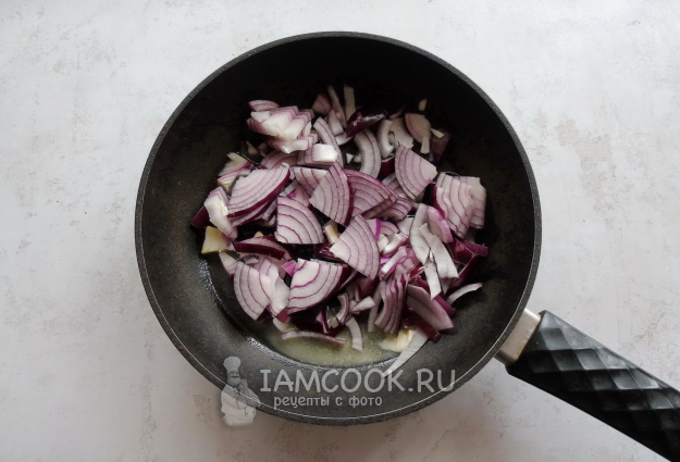 Красный лук очистите, помойте и нарежьте не очень мелко. Добавьте в сковороду.