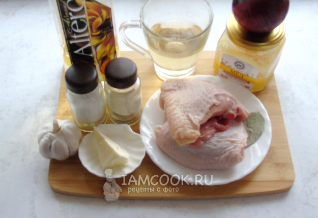 Соберите ингредиенты для приготовления куриных бедер с луком в духовке.