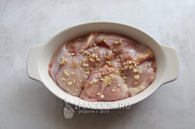 Куриные бедра помойте. Удалите шкурку и косточку. Выложите в жаропрочную форму. Посыпьте чесноком со специями.
