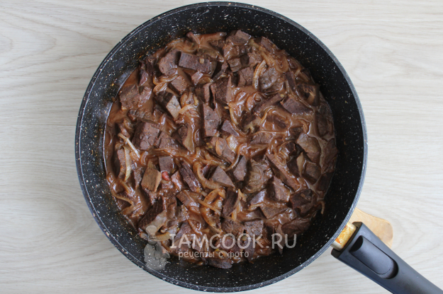 В полученном насыщенном соусе субпродуктам нужно дать напитаться или же просто остыть всему этому вместе.