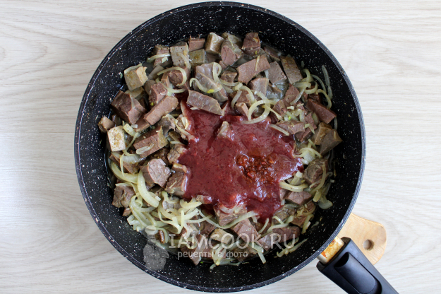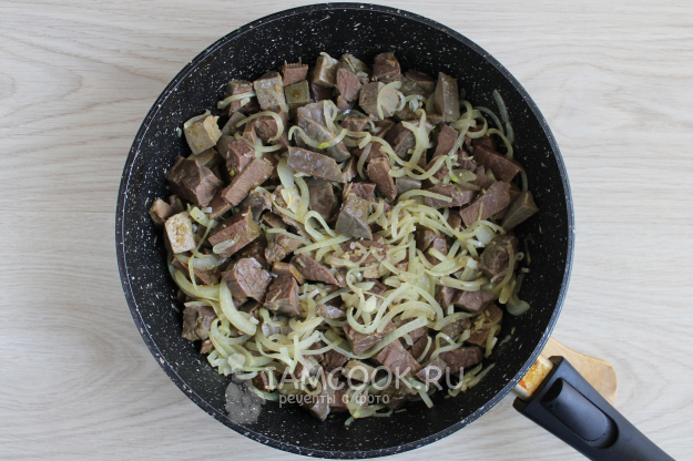 Затем отправьте на сковороду к луку все подготовленные субпродукты.