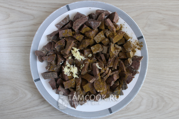 Затем все субпродукты нужно будет нарезать: лёгкие – кусками побольше и потолще, а сердце и печень – потоньше. Посыпьте их солью, смесью хмели-сунели и измельченным чесноком. Перемешайте. Дайте так промариноваться минут 15-20.
