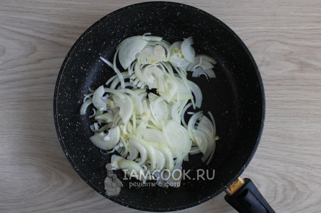Лук нашинкуйте полукольцами, обжарьте и потомите его на сливочном или топлёном масле на среднем огне около пяти минут при помешивании. Хорошо посолите.