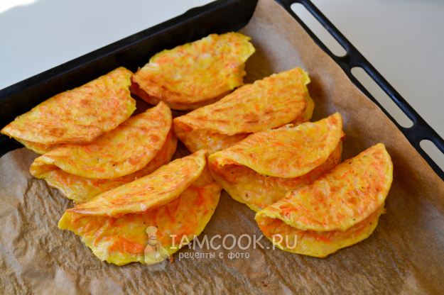 Морковные лепешки готовы. Они легко снимаются с пергамента. Сразу же, пока лепешки горячие, аккуратно сложите их пополам.