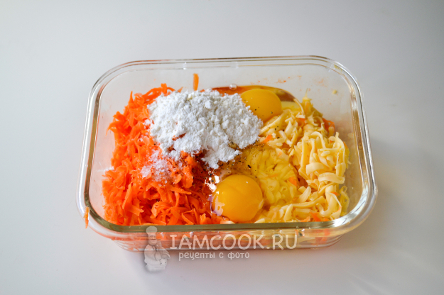 Воду с моркови слейте, а саму морковь хорошо отожмите руками. Добавьте натертый на крупной терке сыр, вбейте яйца, добавьте муку, соль, перец черный молотый.