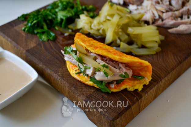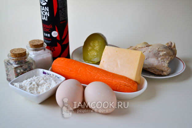 Соберите необходимые продукты для приготовления морковных тако. Начинка может любая по вашему вкусу. Я использую вареное куриное бедро и голень, маринованный огурец, соус из майонеза и соевого соуса.
