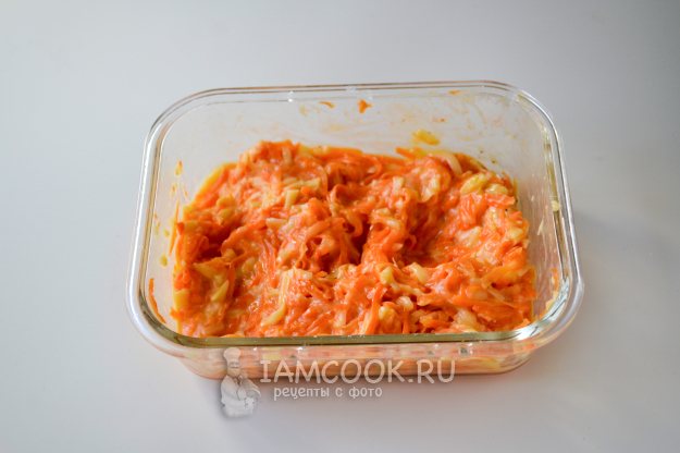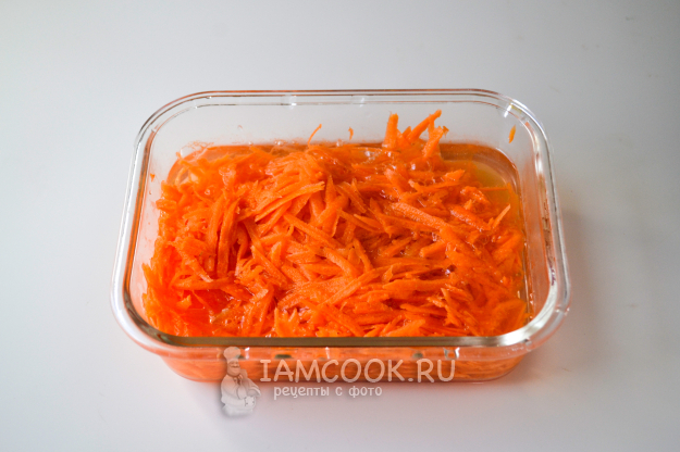 Морковь почистите, вымойте, натрите на крупной терке. Положите в миску, залейте кипящей водой на 8-10 минут.