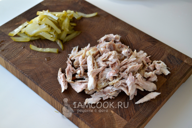 Для начинки нарежьте вареное куриное мясо соломкой, маринованный огурец - тонкой соломкой. Для соуса соедините майонез и соевый соус.
