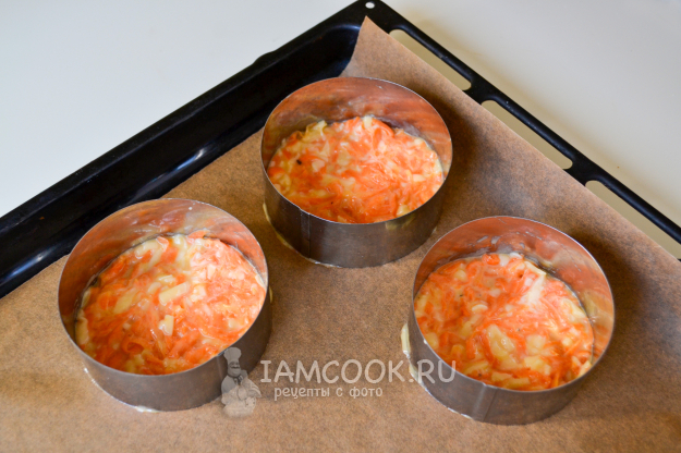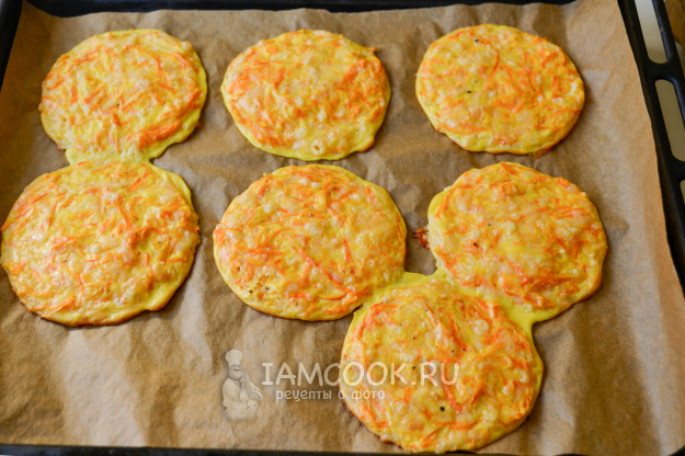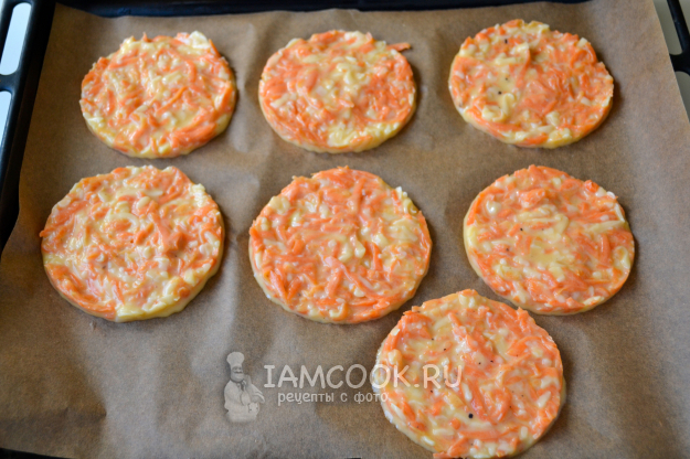Разложите морковную массу в форме лепешек толщиной 5-6 мм на противне, на пекарской бумаге. Для удобства можно использовать кулинарное кольцо.