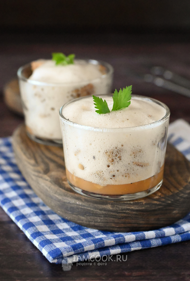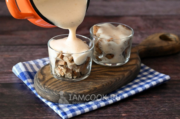В любую посуду, в которой будете подавать гоголь-моголь, положите кубики хлеба и залейте яичной пеной.
