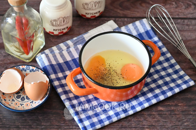 В мисочку вбейте яйца, добавьте по щепотке соли, перца и влейте немного столового уксуса. Уксус - ингредиент необязательный, это дело вкуса.