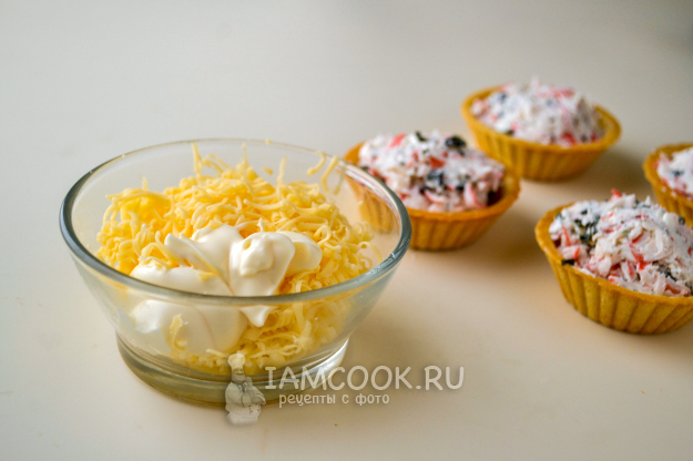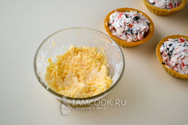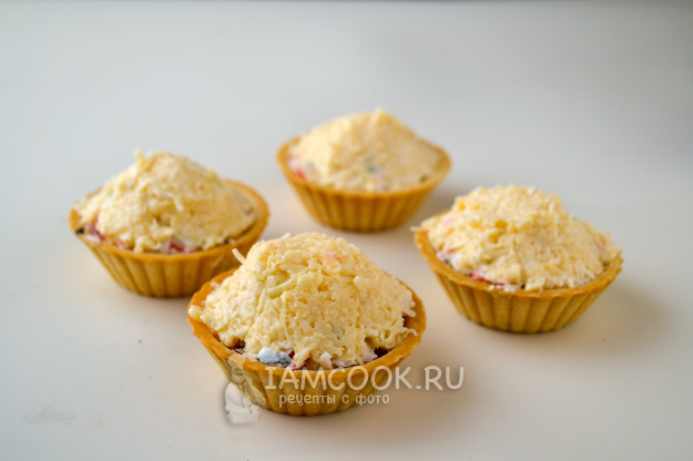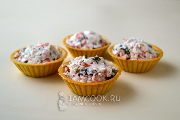 Заполните тарталетки крабовой массой с небольшой горкой.
