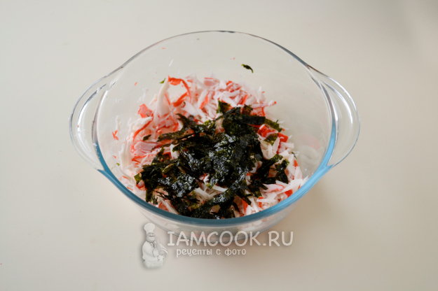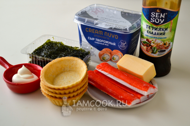 Соберите продукты для приготовления ленивых суши с крабовыми палочками в тарталетках и запекания их в аэрогриле.
