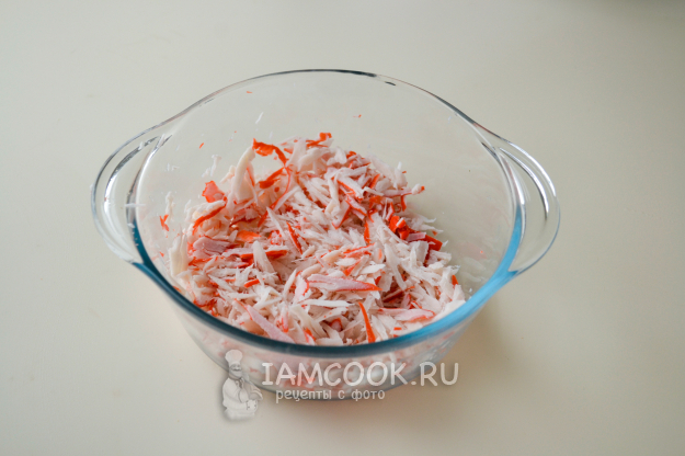Крабовые палочки освободите от упаковки и натрите на крупной терке. Удобно натирать, если палочки будут подморожены.