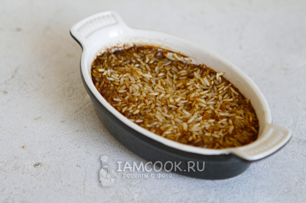 Подготовьте подходящую форму для запекания. Переложите в нее рис с жидкостью. В зависимости от сорта риса количество воды может меняться. Важно: жидкость должна покрывать рис примерно на 1 см. Чтобы верхние рисинки не высохли, форму можно прикрыть фольгой.