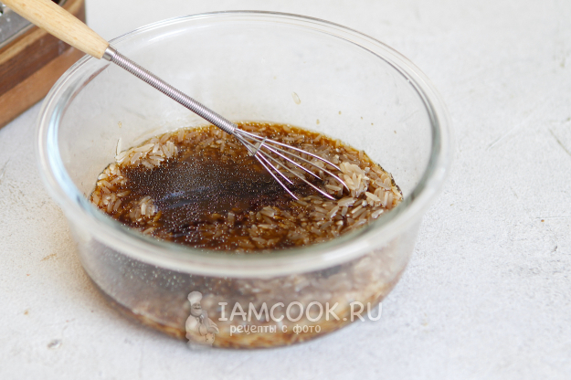 В чаше соедините соевый соус, чеснок и масло оливковое. Размешайте все ингредиенты. Важно: соевый соус не должен быть сильно соленым, иначе рис вы не сможете есть. Прежде чем добавить соевый соус, попробуйте его на вкус. Если сильно соленый, добавляйте меньше соуса, но больше воды. В любом случае количество воды и соуса лучше отрегулировать под себя.