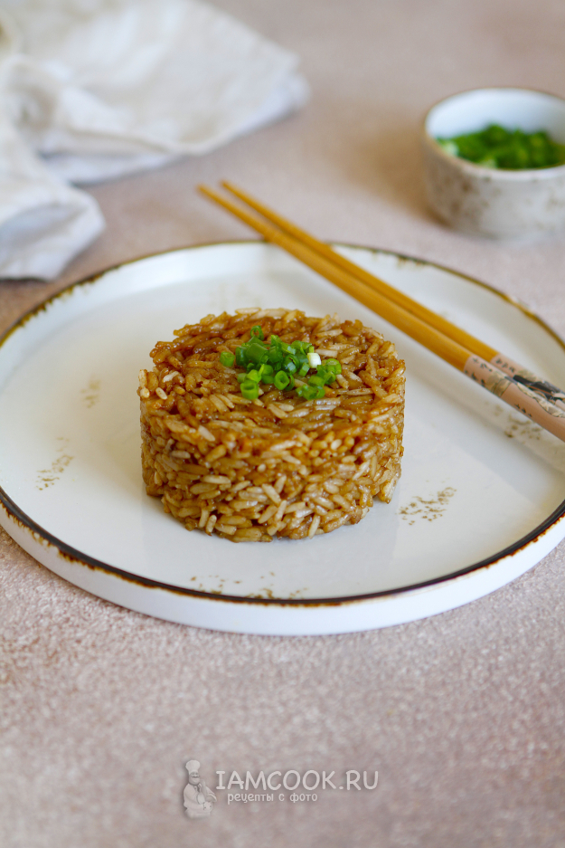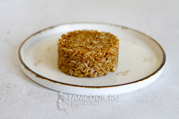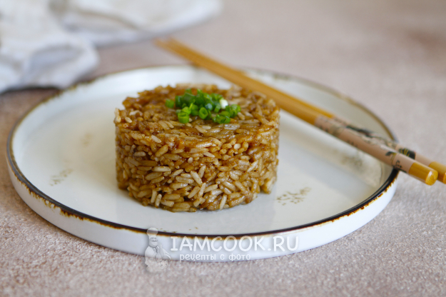 Отправьте рис в заранее разогретую духовку. Запекайте рис в соевом соусе в духовке при 180-185 градусах 30-35 минут. Перед тем как достать рис, попробуйте его на зубок. Если он жесткий, а вода уже вся испарилась, добавьте немного кипяченой воды и продолжите готовить рис до полной его готовности.