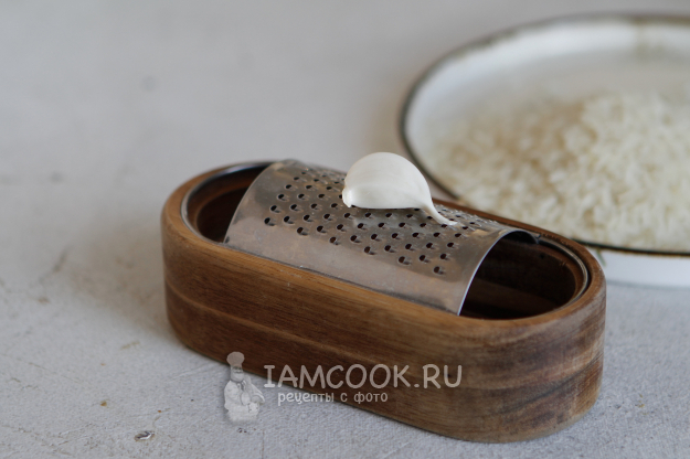 Один небольшой зубчик чеснока мелко нашинкуйте или натрите на терке.