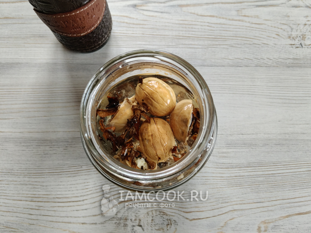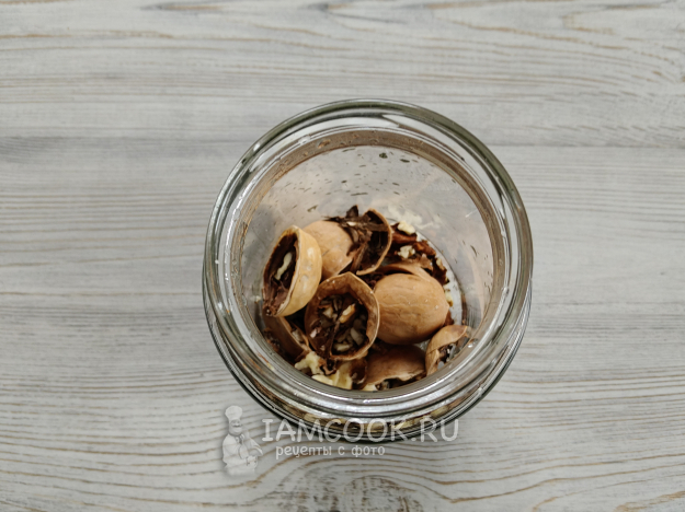 Орехи тщательно вымыть и разломать сразу в чистую банку.