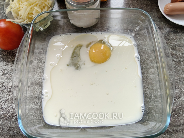 В миску разбить яйцо, добавить соль, сахар, масло и молоко.