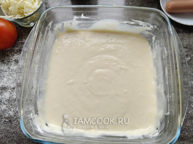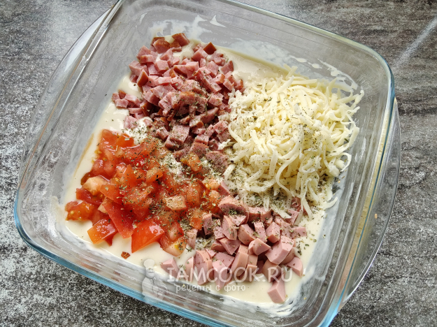 В тесто натереть сыр, добавить нарезанные кубиками помидор, колбасу и сосиску.