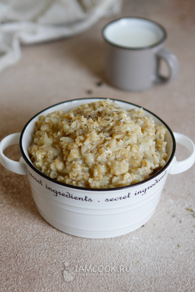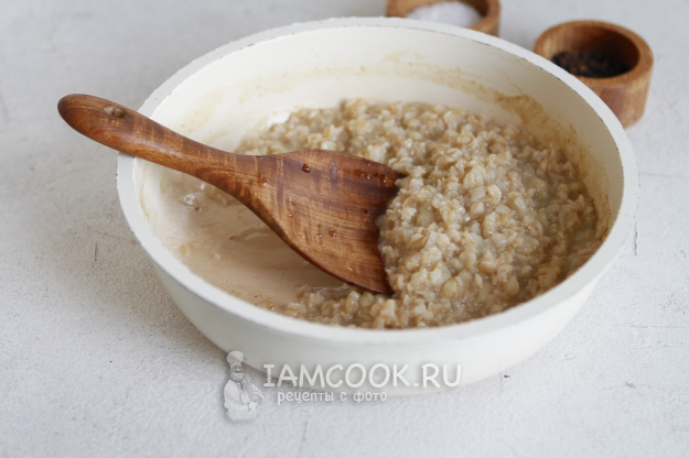 Как только лук будет готов, всыпьте овсянку. Мои рекомендации: выбирайте хлопья долгой варки.