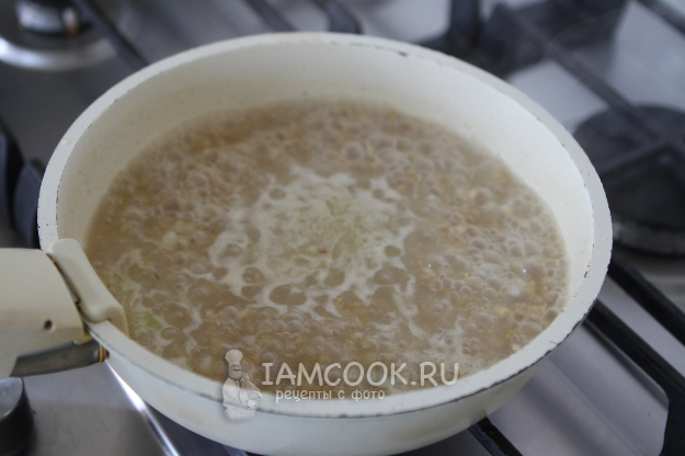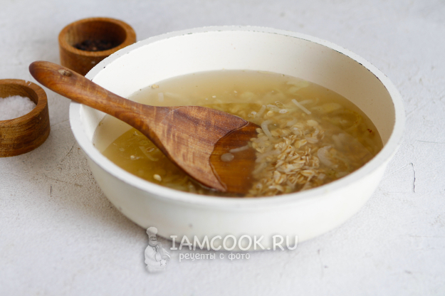 Влейте мясной бульон. Жидкость обычно добавляют 1:3. Я же добавила чуть больше, так как супруг попросил сварить овсянку «размазню».