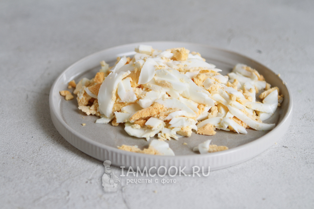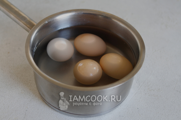 Яйца необходимо отварить вкрутую. Промойте яйца под проточной водой и сложите в сотейник. Воду доведите до кипения, убавьте огонь и варите яйца 10 минут.