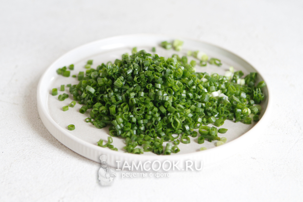 Лук зеленый необходимо тоже хорошо промыть под проточной водой. Я всю зелень обычно замачиваю в воде на 10 минут, потом тщательно высушиваю на бумажном полотенце. Нашинкуйте лук.