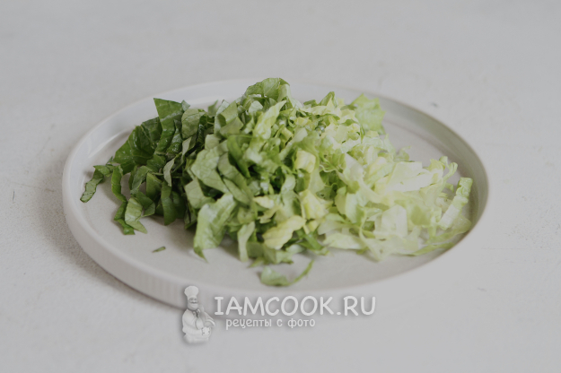 Листья салата Романо нарежьте тонкими полосками. Если не нашли листья салата Романо, можно взять листья Айсберга, они тоже хрустящие и сочные.