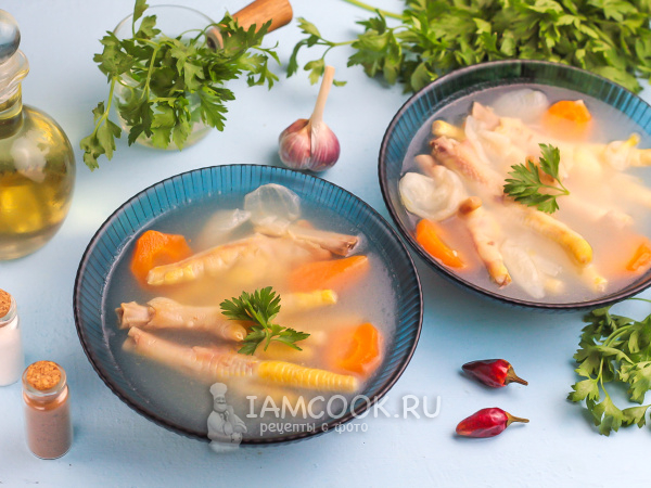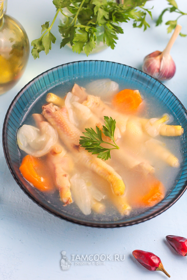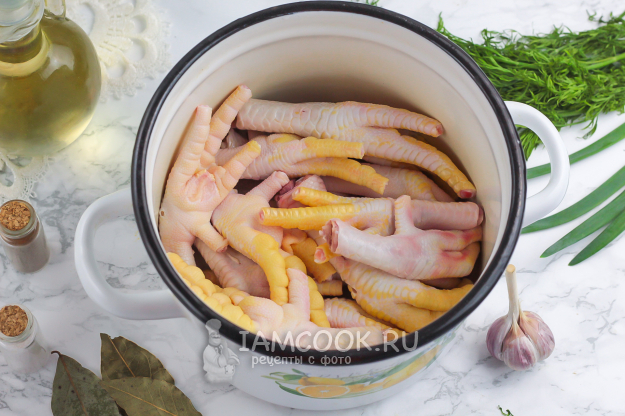 Куриные лапки тщательно очистите от чешуйчатой желтой кожицы, срежьте когти и промойте в воде. Если на подушечках есть черные наросты - их тоже срежьте. Выложите лапки в кастрюлю.