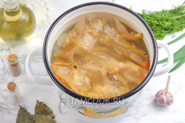 Влейте кипяток и доведите содержимое емкости до кипения. Слейте первую воду - она будет грязной. Затем снова залейте кипяток и доведите жидкость до кипения. Добавьте лавровые листья, соль и перец. Убавьте нагрев до умеренного, практически минимального и накройте бульон пергаментной бумагой, вырезав ее по диаметру. Крышка вам не понадобится - если накрывать крышкой, то бульон получится мутным.