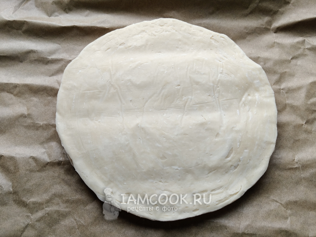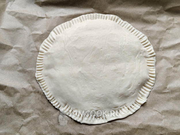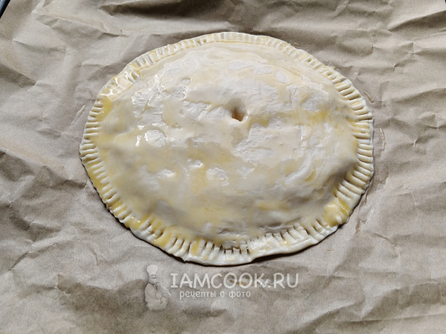 Смазать верх оставшимся яйцом, в центре сделать ножом дырочку.