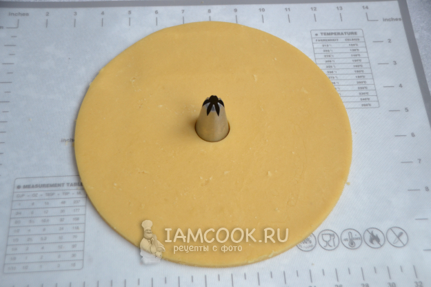 Раскатайте вторую часть теста в пласт того же диаметра (24 см). В центре сделайте отверстие.