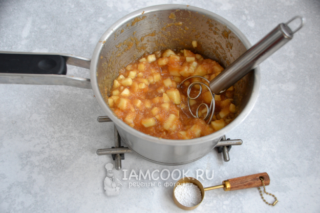 Нагрейте на среднем огне яблоки до температуры не выше +45 градусов, всыпьте сахар с пектином, доведите до кипения, с момента закипания варите еще примерно 30 секунд. Снимите с огня, добавьте лимонную кислоту, смешайте. При желании можно добавить немного корицы.
